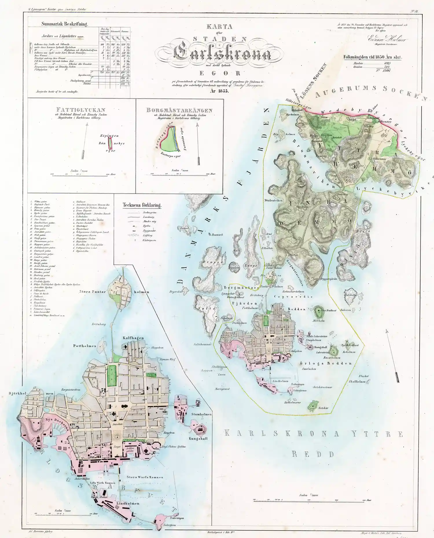 Karta över staden Karlskrona med därtill lydande ägor
