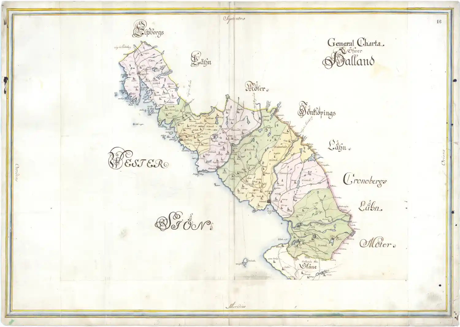 Geografisk karta över landsvägarna genom Halland med de därintill belägna ordinarie post- och gästgivaregårdarna, författad av ordinarie lantmätaren Petter Wÿckman