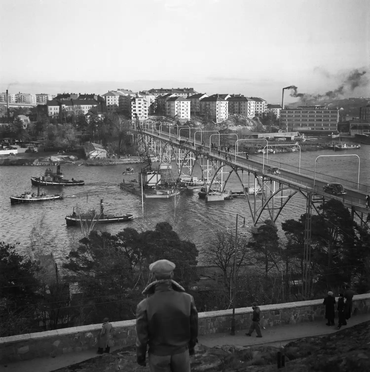 Stora Essingebron och Lilla Essingen, vy från Stora Essingen samma dag som bussolyckan. (Buss på linje 96 krockade med lastbil och störtade genom broräcket. 11 personer omkommer, 1 överlever).