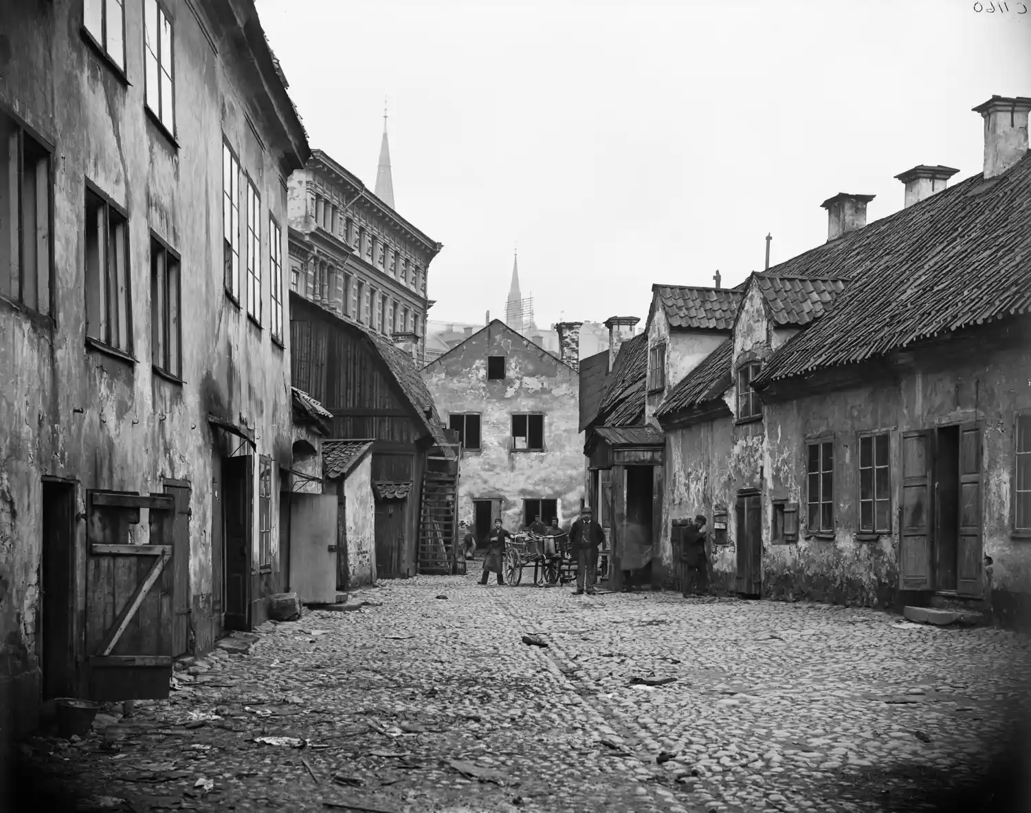 Landbyska verket var ett bryggeri och fick sitt namn av ägaren, Christian Landby. Johannes kyrka sticker upp ovanför hustaken.