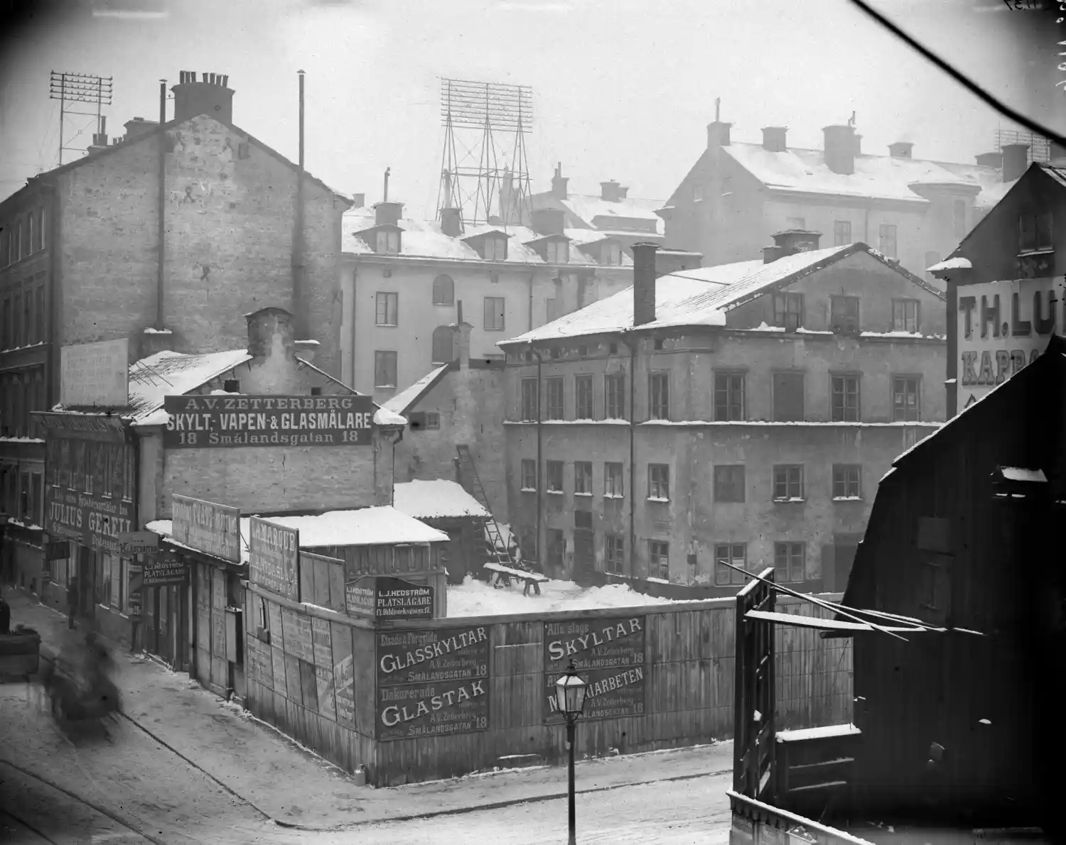Biblioteksgatan 17 i hörnet av Lutternsgatan. Här ligger nu Kungsgatan 1. En telefongalje på hustak i bakgrunden.