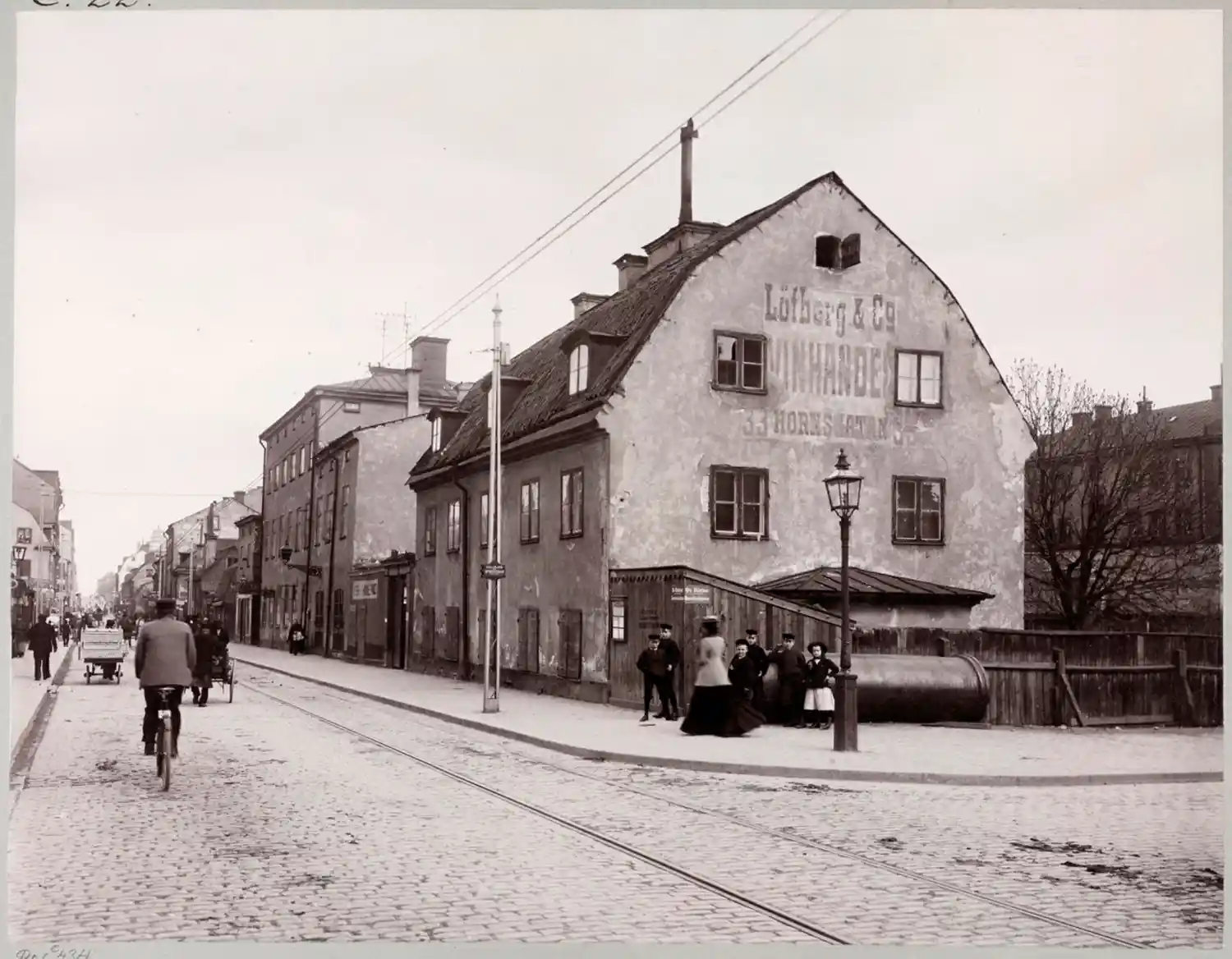 Hornsgatan österut från Rosenlundsgatan. Reklamskylt för vinhandel.