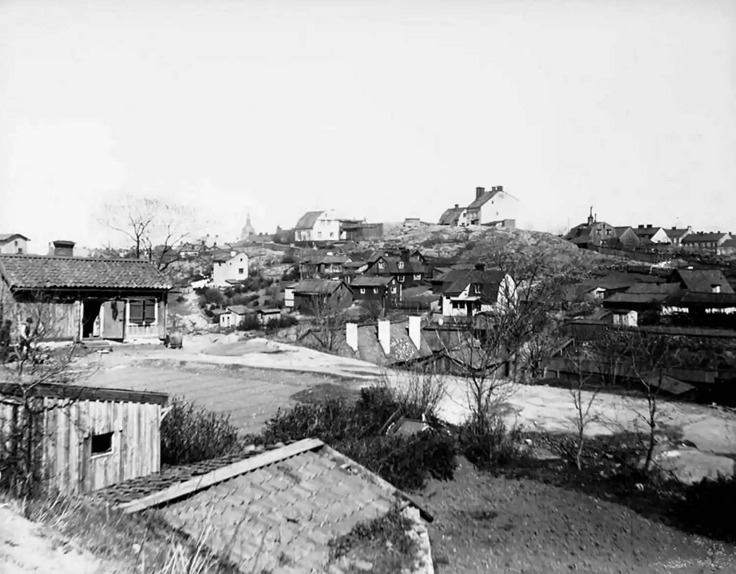 Vita Bergen. Vy västerut i området kring Lilla Mejtens Gränd. Idag ligger Sofia kyrka på kullen.