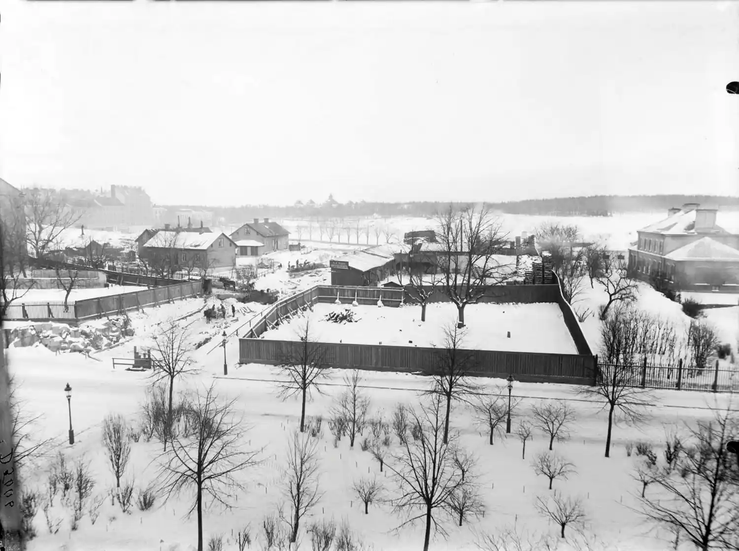 Vy från Karlavägen mot Ladugårdsgärdet. Byggnaderna i bildens mitt t.v. var G A Ullmans Ångvedsågeri, Tyskbagargatan 13. Skeppargatan anläggs. T.h. Veterinärinstitutet.