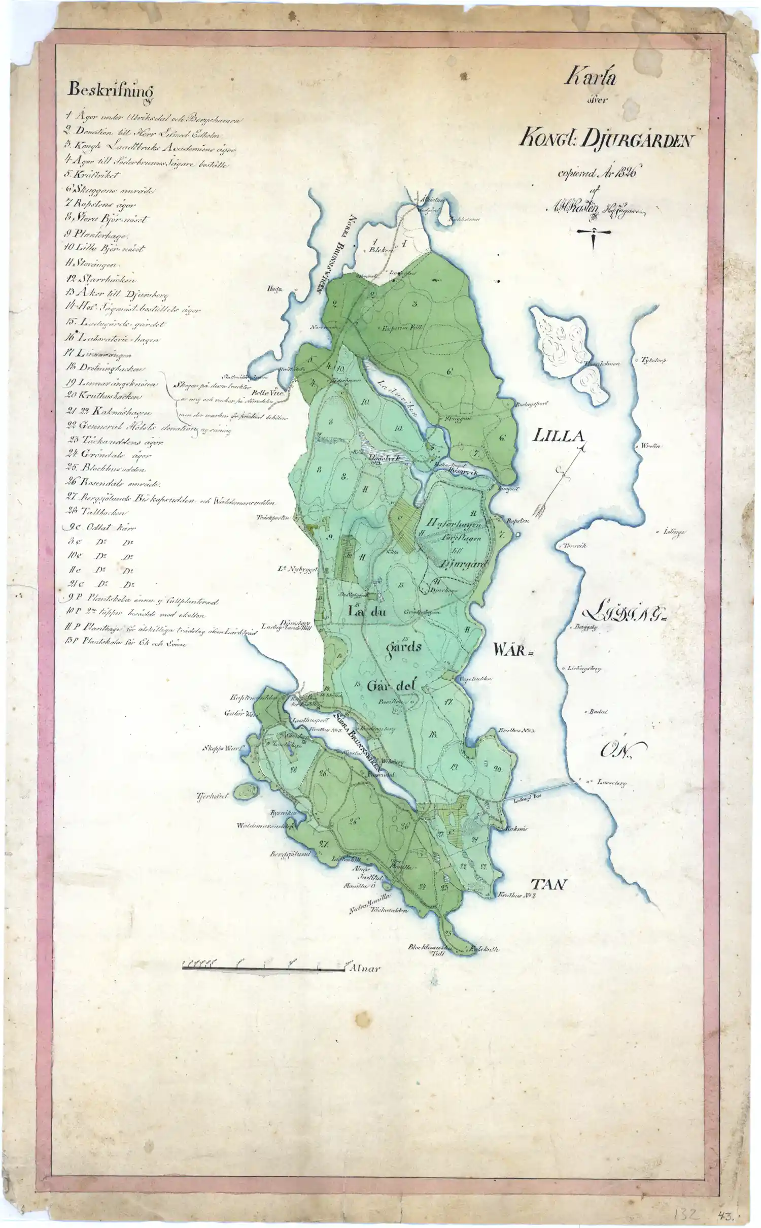 Karta över en del av Tegeludds & Blåports revir Kungliga Djurgården vid Stockholm