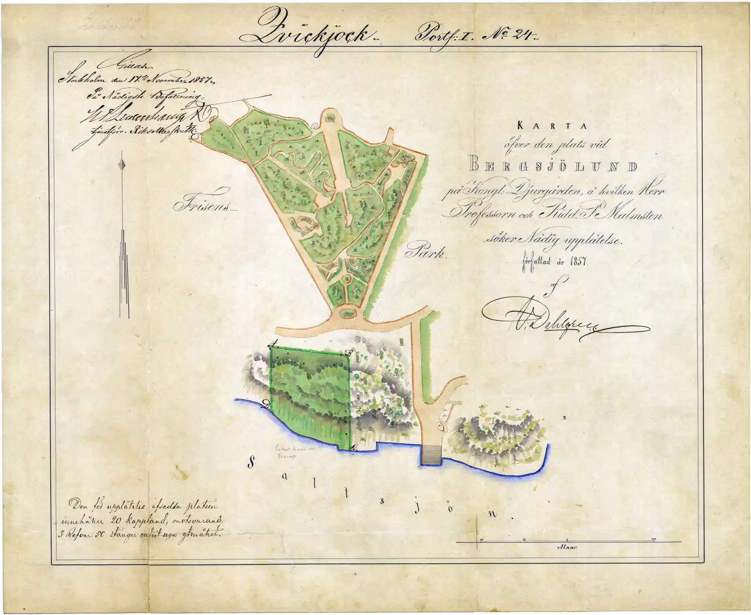 Karta över den plats vid Bergsjölund på Kungliga Djurgården å vilken herr professorn och riddaren P Malmsten söker nådig upplåtelse