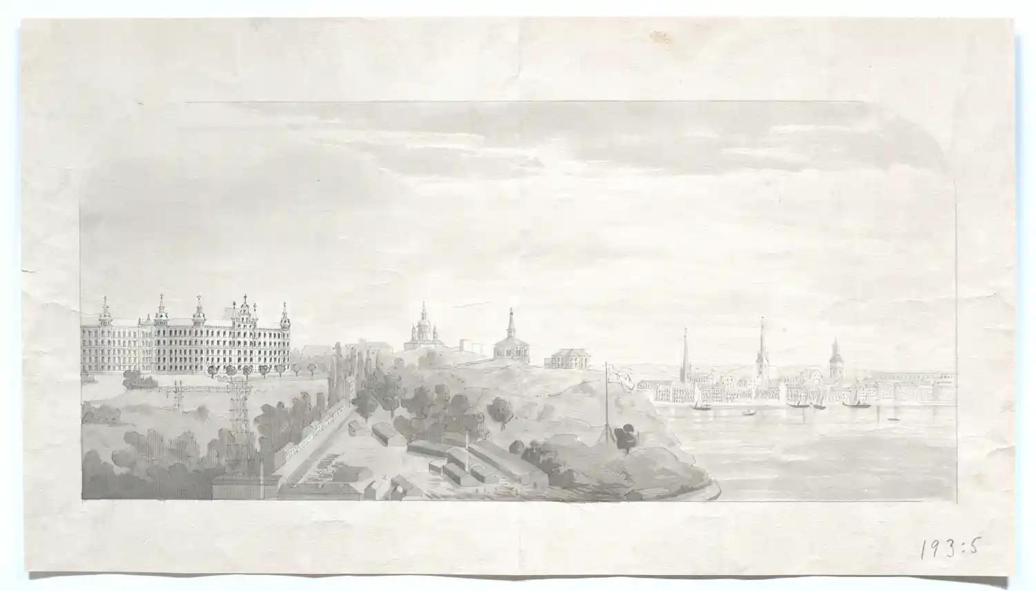 Utsikt från trakten vid vid Erstabergen över Fåfängan och Gamla Stan. Katarina Kyrka i fonden,. Tuschteckning