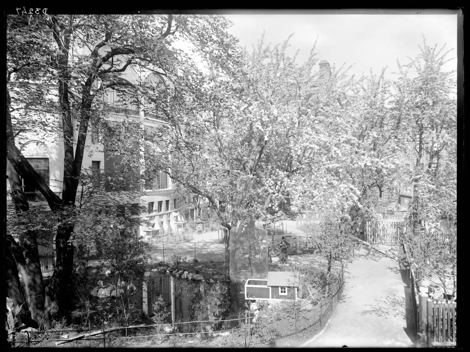 Till vänster bakom grönskan skymtar Centralbadets gårdsfasad.