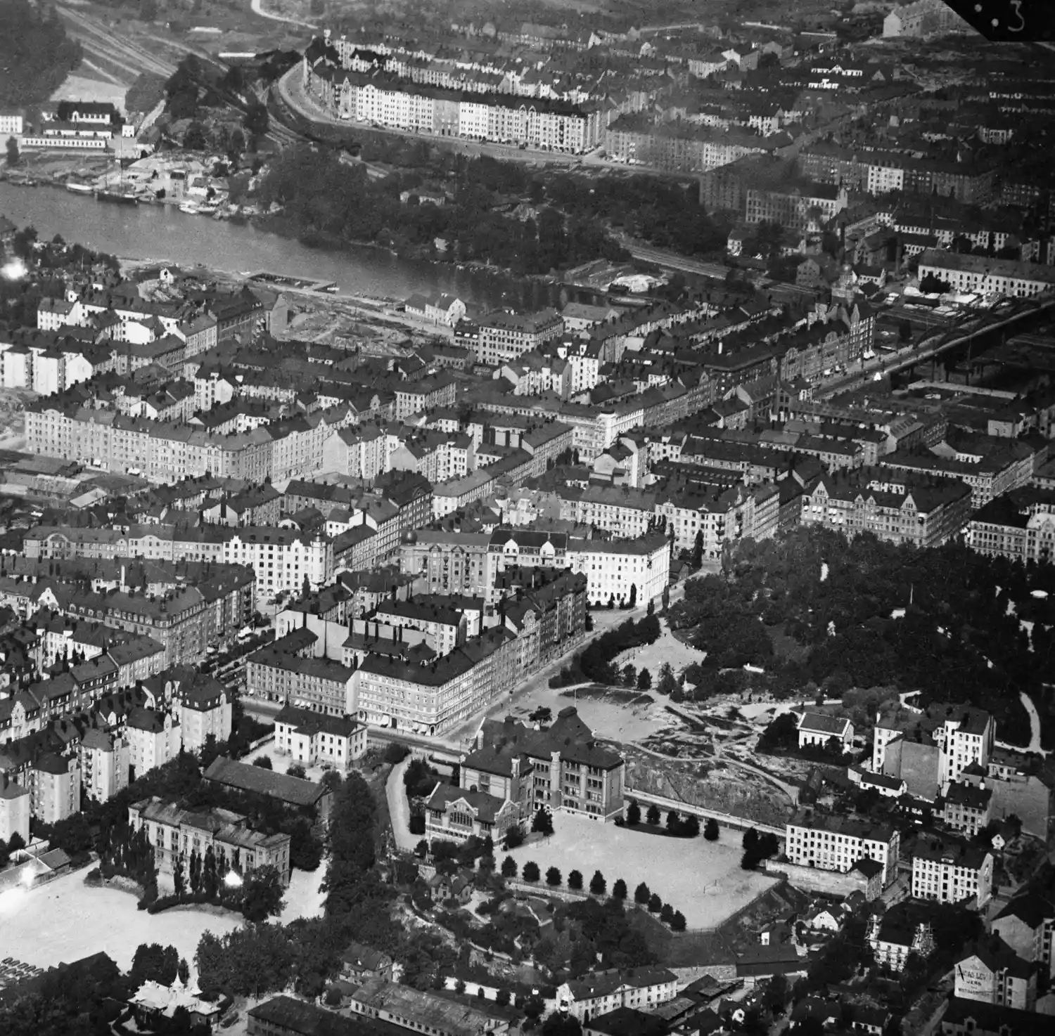 Flygbild över parti av Kungsholmen, mot nordväst. Kring Sankt Eriksgatan.Del av Rörstrandsgatan i fonden.