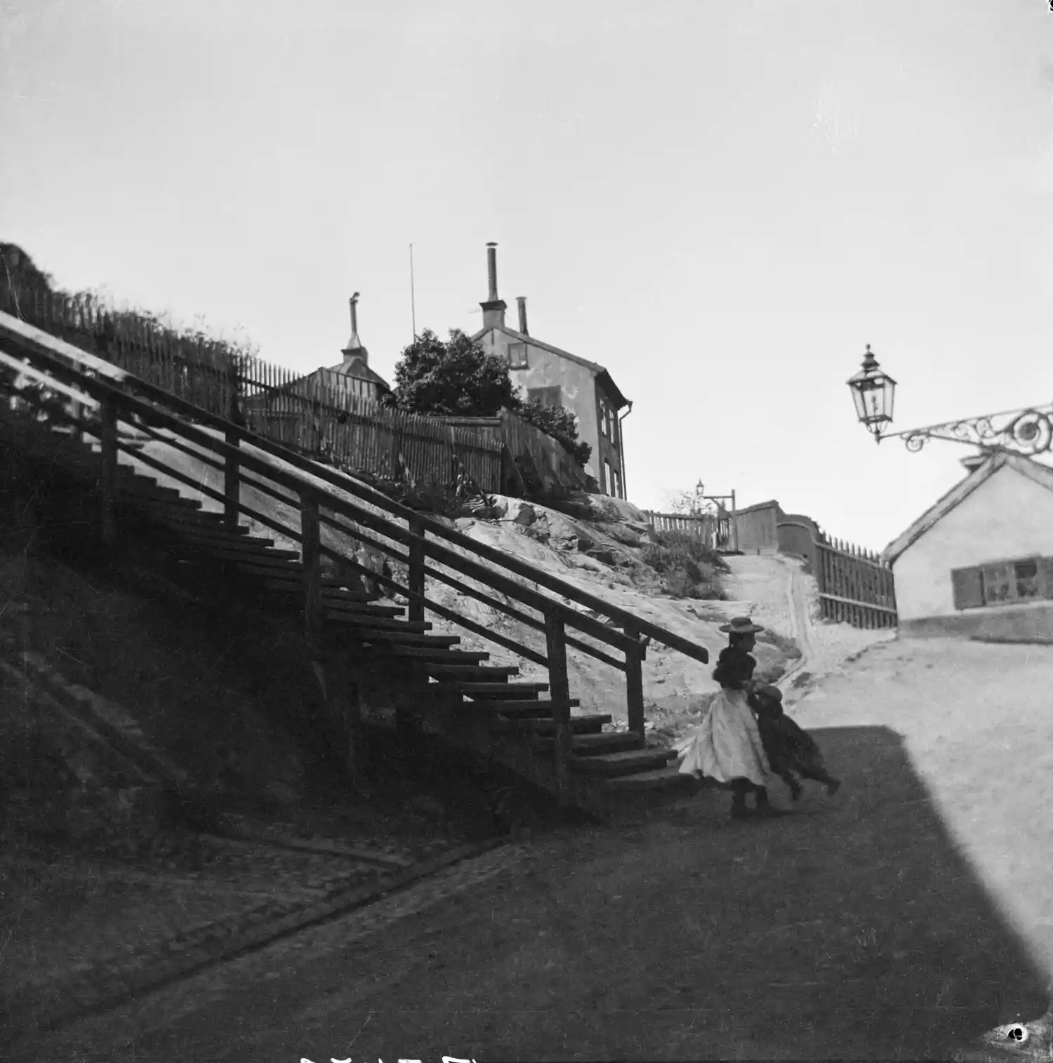 Trappor från Östra Kvarngränd mynnar i norr vid Kaplansbacken 15. Vid foten av trappan två barn. Här ligger numera Jeppes Trappor. Senare kv. Rubinen, nu kv. Stadsarkivet.