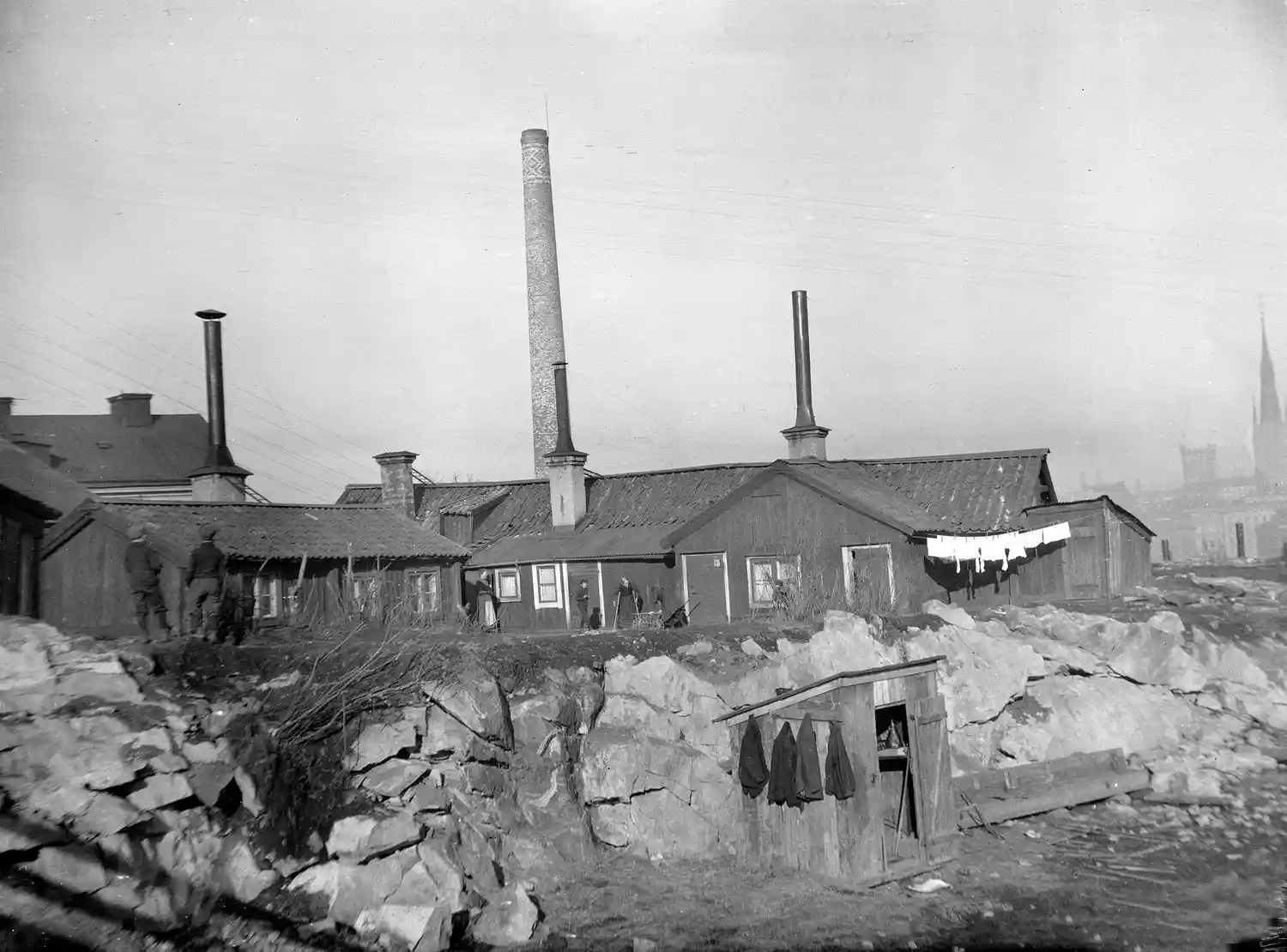 Östra Kvarngränd 6 och 4. Från Kungsholms Kyrkoplan ledde Östra Kvarngränd norrut. Husen ägdes av Bolinders AB och Bolinders fabriksskorsten ses i öster bakom taken. Nu Kungsklippan, kv. Stadsarkivet.