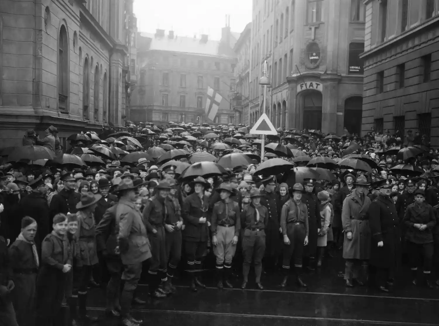 Nyckelord: Scouter, Paraplyer, Folksamlingar, Uniformer, Begravningar, Poliser
