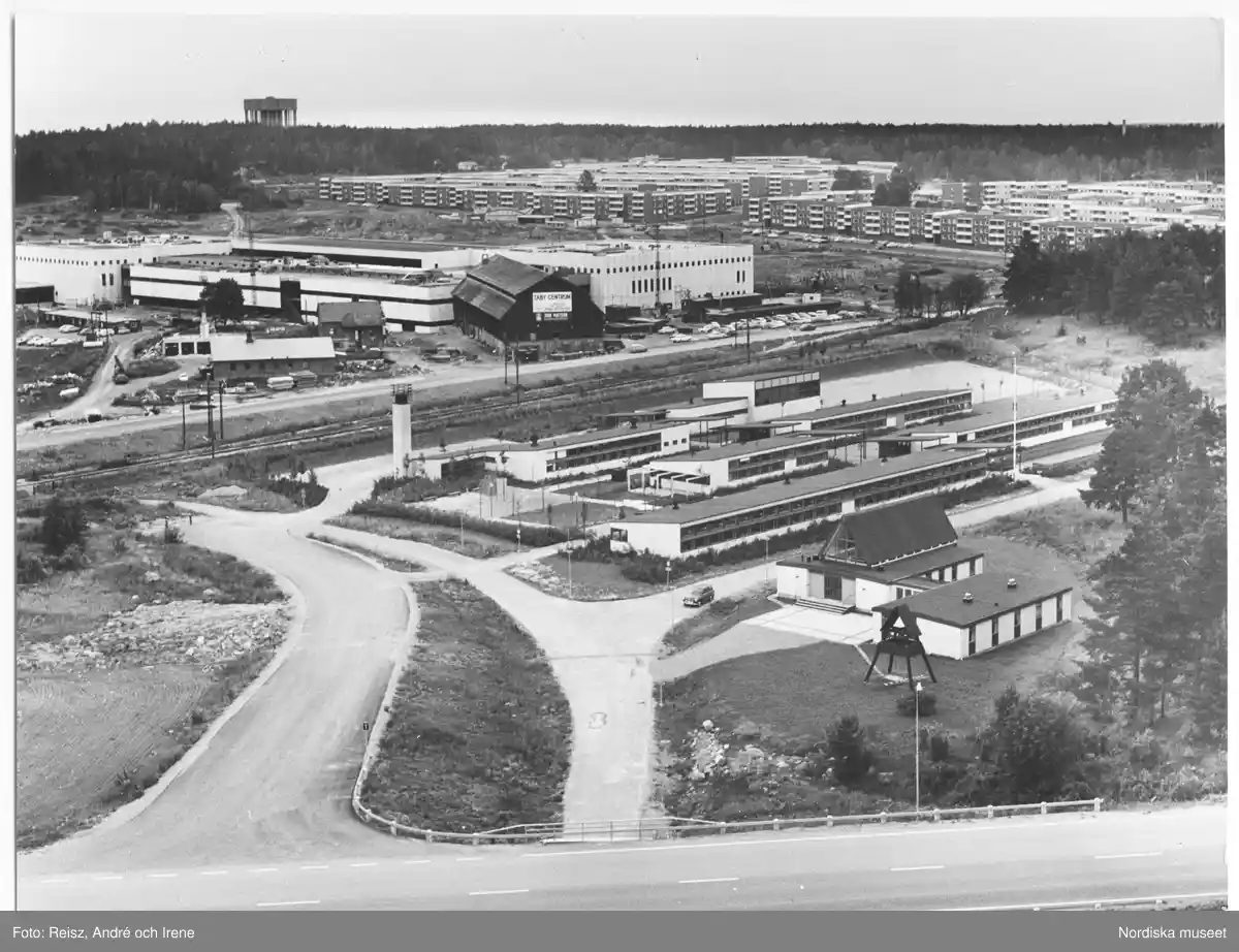 Grindtorpskyrkan närmast kameran. Täby centrum i mitten. Ladan tillhörde tidigare Tibble gård och sparades till en början som magasin innan den revs. Längre bort Åkerby.