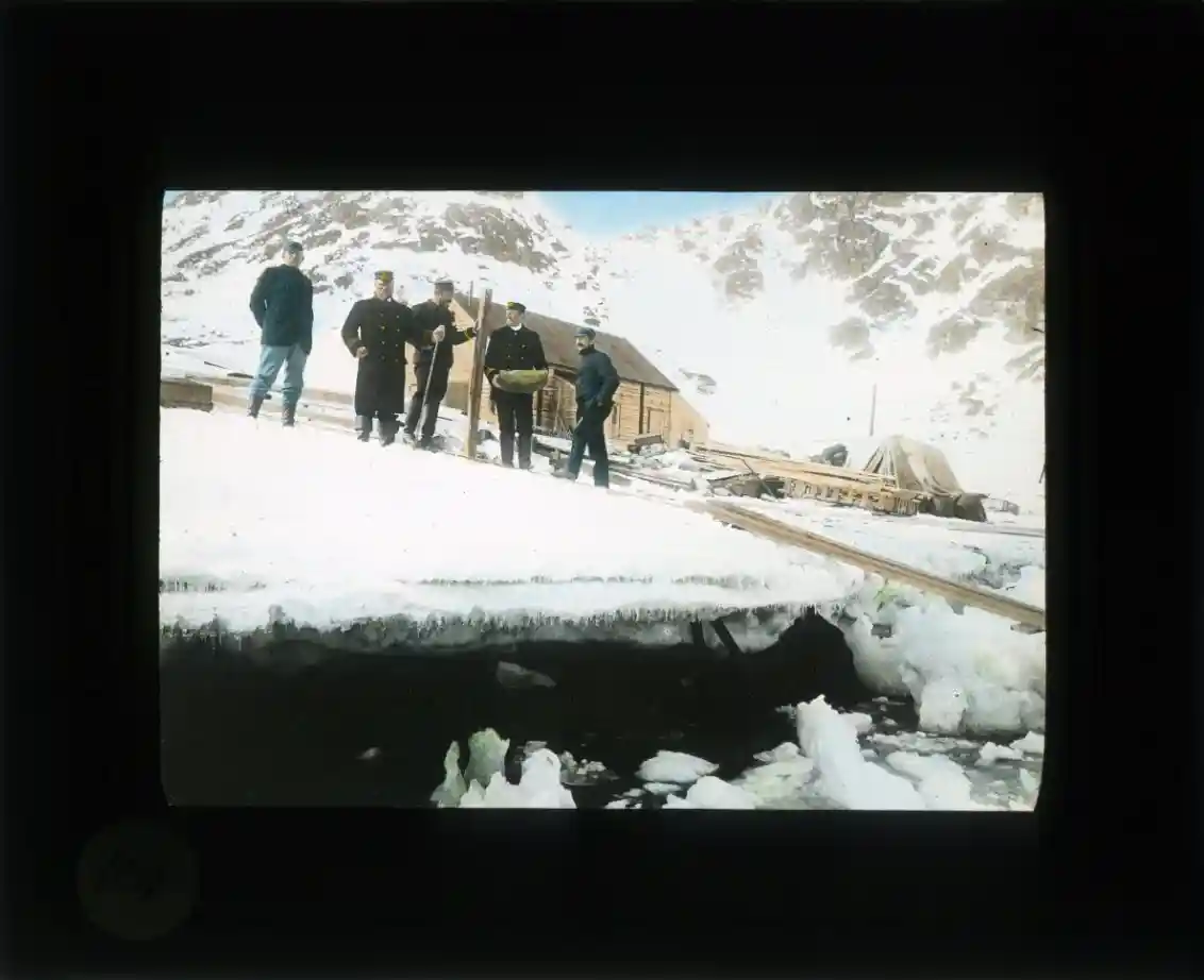 Fem män står på en iskant nedanför Pikes hus på Danskön. De är från vänster: Andrée, Ehrensvärd, Norselius på skidor, Celsing samt Machuron. Färglagt motiv.